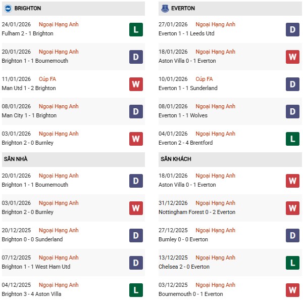 Theo bảng xếp hạng sau 23 vòng đấu, Brighton đang đứng thứ 12 với 30 điểm, trong khi Everton xếp thứ 10 với 33 điểm. Khoảng cách chỉ là 3 điểm cho thấy đây là cặp đấu khá cân bằng về mặt vị trí, tuy nhiên giới chuyên môn vẫn xếp Brighton cửa trên với kèo chấp -0.5 nhờ lợi thế sân nhà. Brighton có thành tích 7 thắng, 9 hòa và 7 thua, ghi 33 bàn và để lọt lưới 31 bàn. Lối chơi của đội chủ sân Amex thiên về kiểm soát bóng và tấn công biên, nhưng điểm yếu là khả năng dứt điểm chưa thực sự ổn định. Dù vậy, họ thường chơi khá tốt khi được đá trên sân nhà.