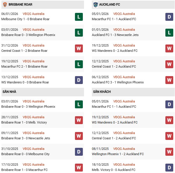 - 4 lần gần nhất gặp nhau, Auckland thắng 2 và hòa 2 trước Brisbane Roar.