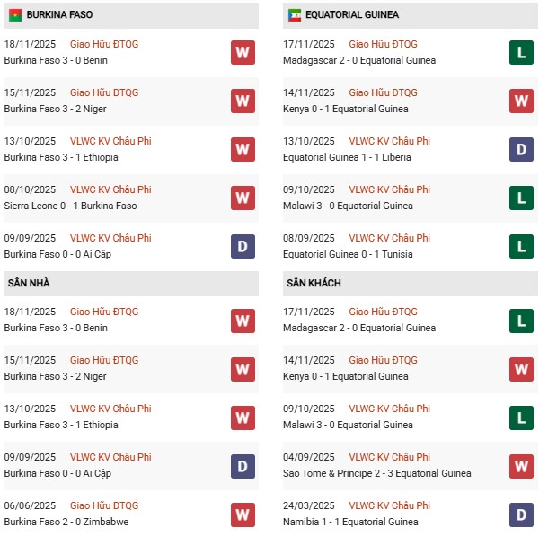 Burkina Faso đang có chuỗi thành tích cực kỳ ấn tượng với 4 trận thắng liên tiếp gần đây (thắng Benin 3-0, Niger 3-2, Ethiopia 3-1 và Sierra Leone 1-0). Họ cho thấy sức mạnh tấn công đa dạng khi ghi ít nhất 3 bàn/trận trong 3 trận gần nhất. Equatorial Guinea thường gặp khó khăn khi thi đấu xa nhà. Trong 20 trận gần nhất trên sân khách hoặc trung lập, họ chỉ giành được 2 chiến thắng nhưng phải nhận tới 13 thất bại.
