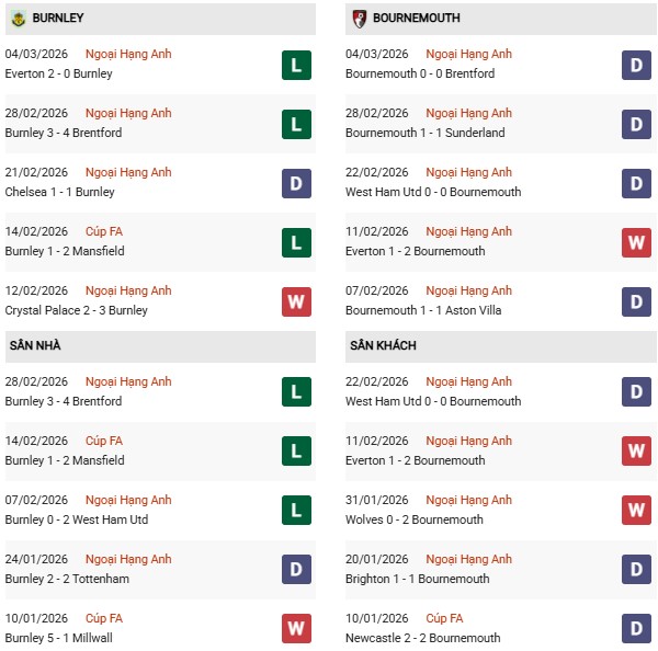 - 10 lần gần nhất gặp nhau, Burnley thắng 5 thua 4 và hòa 1 trước Bournemouth.