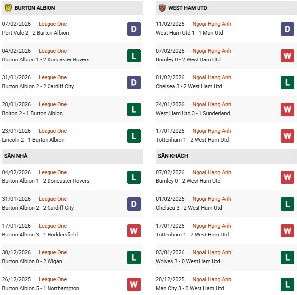Thống kê đối đầu Burton vs West Ham: