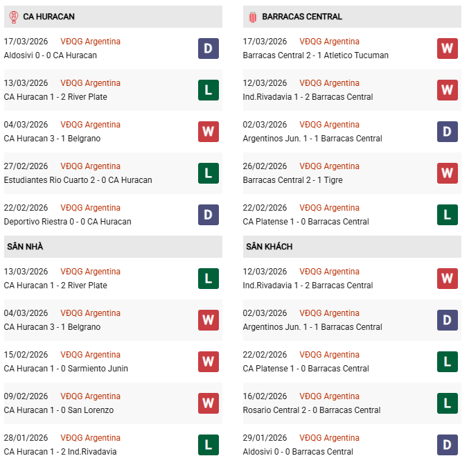 Thống kê phong độ CA Huracan vs Barracas Central: