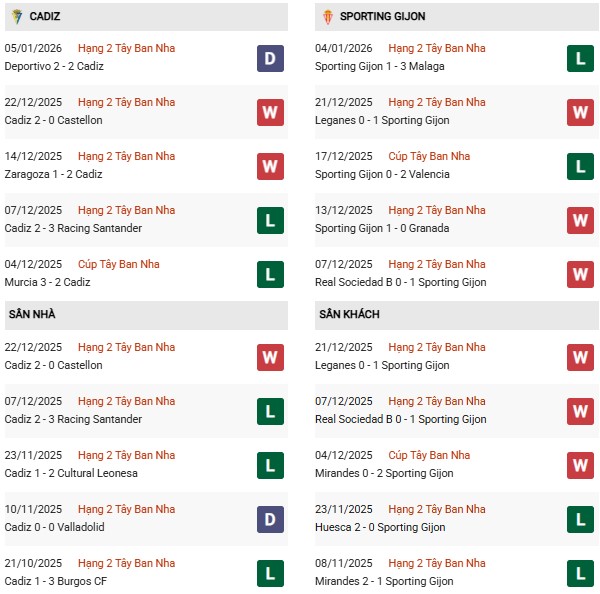 Thống kê phong độ Cadiz vs Sporting Gijon: