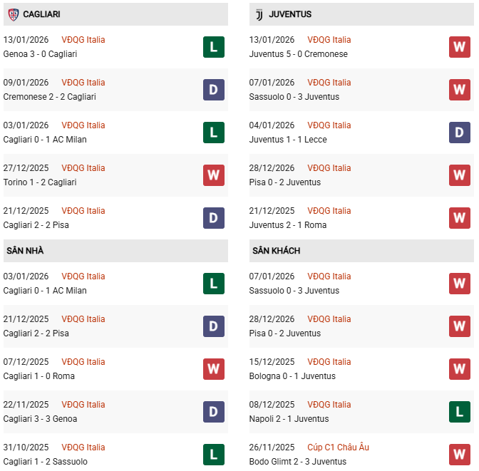 Thống kê phong độ Cagliari vs Juventus:
