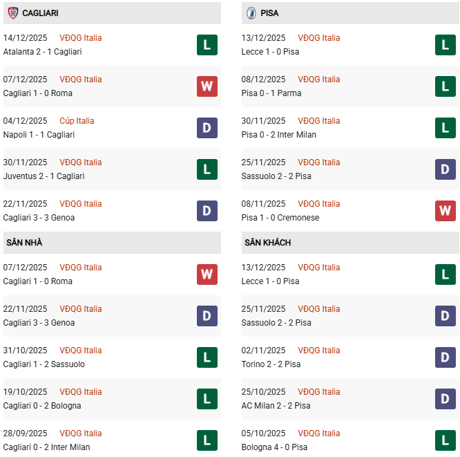 Lợi thế sân nhà và thứ hạng: Cagliari đang xếp thứ 15 với 14 điểm, trong khi Pisa đứng áp chót bảng xếp hạng (hạng 19) với chỉ 10 điểm. Tại sân nhà, Cagliari có phong độ ghi bàn ổn định hơn.
