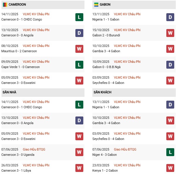 - 6 lần gần nhất gặp nhau, Cameroon thắng 3 thua 2 và hòa 1 trước Gabon.