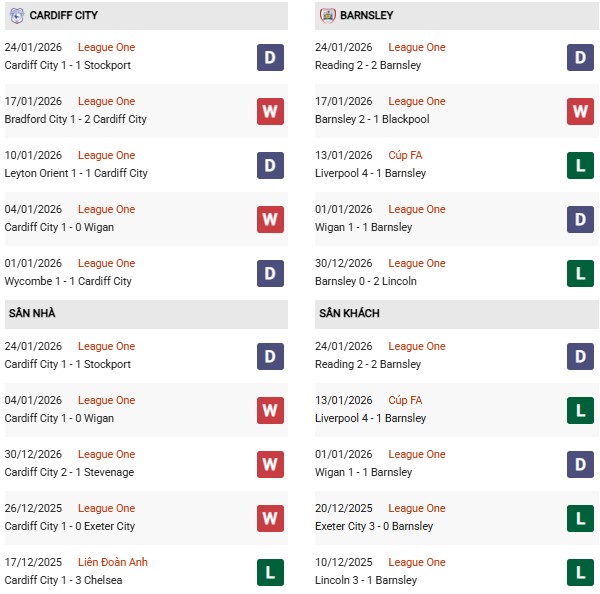 - 10 trận đối đầu gần nhất giữa 2 đội, Cardiff thắng 6, thua 1 trước Barnsley.