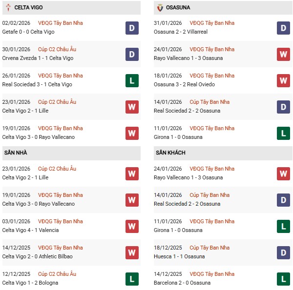 Thống kê phong độ Celta Vigo vs Osasuna: