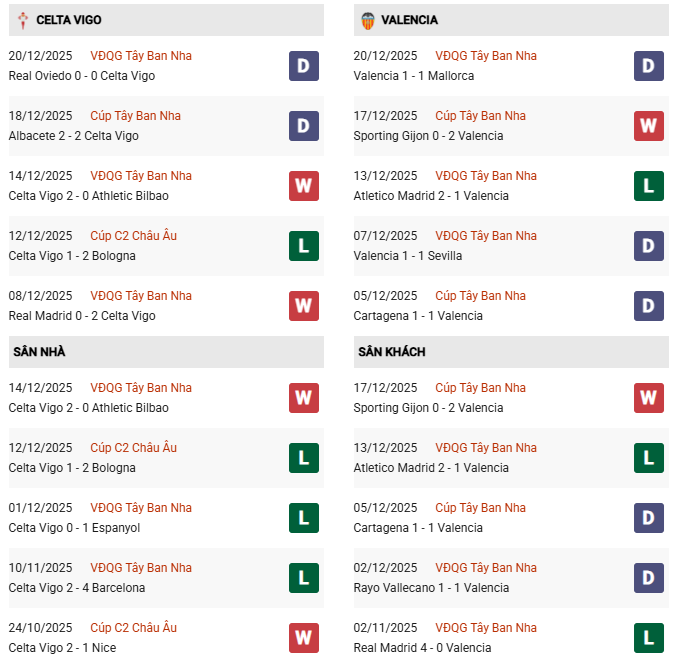 Thống kê phong độ (từ hình ảnh): Trong 5 trận gần nhất của Celta Vigo, có tới 3 trận kết thúc với tổng tỉ số từ 2 bàn trở xuống. Valencia cũng có chuỗi trận hòa với tỉ số thấp (1-1, 0-0) liên tục trong thời gian qua.