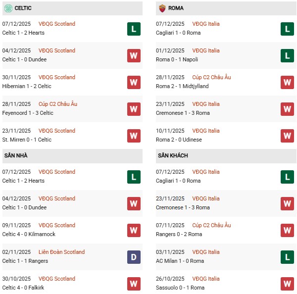 Thống kê phong độ Celtic vs AS Roma: