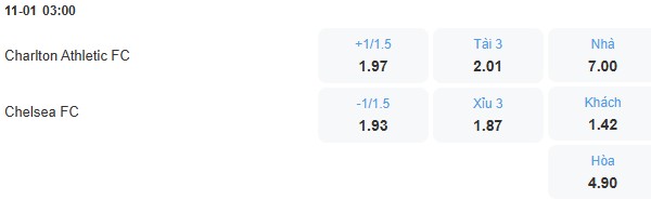 Charlton chỉ là đội bóng yếu ở Championship, nơi họ đang cố gắng trụ hạng nên chất lượng đội hình thua kém Chelsea rất nhiều. Trong khi đó đội khách đang không có thành tích tốt và cần một chiến thắng để tìm lại sự tự tin nên họ sẽ quyết tâm chơi tốt. Nên với tỉ lệ kèo Chelsea chấp 1 1/4 trái thì nên đặt cửa cho đội khách.