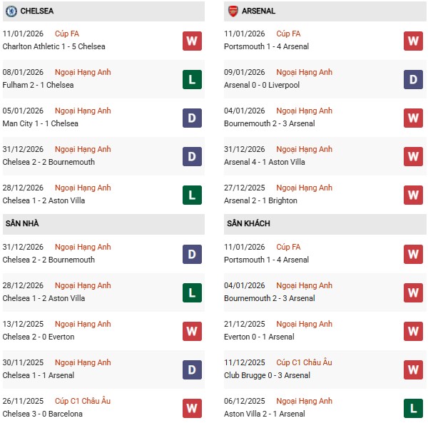 Ngược lại, Arsenal đang thể hiện sức mạnh tuyệt đối khi chễm chệ ở ngôi đầu bảng Premier League với 49 điểm, bỏ xa Chelsea tới 18 điểm. Thầy trò HLV Mikel Arteta đang sở hữu phong độ hủy diệt với chuỗi kết quả ấn tượng: thắng 4-1 trước Aston Villa, 3-2 trước Bournemouth và vừa đè bẹp Portsmouth 4-1 tại FA Cup. Đặc biệt, Arsenal đang là đội bóng có thành tích sân khách tốt nhất giải đấu với chuỗi 5 trận thắng liên tiếp khi phải hành quân xa nhà. Sự ổn định về nhân sự và lối chơi giúp “Pháo thủ” được đánh giá cao hơn dù phải làm khách tại Stamford Bridge.