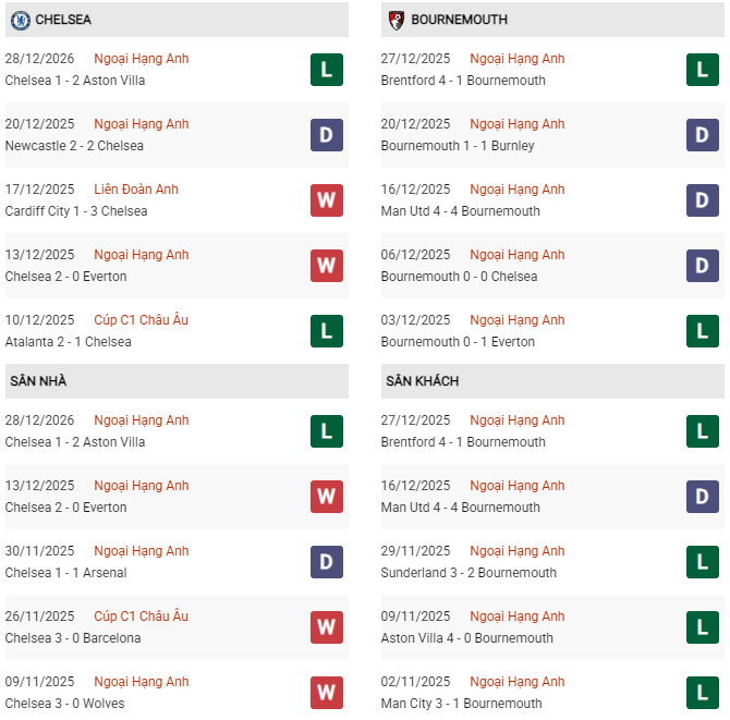 Thống kê đối đầu Chelsea vs Bournemouth: