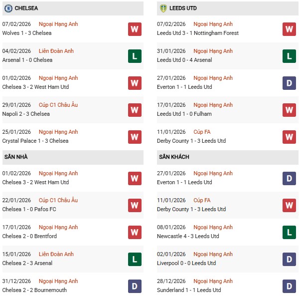 Lịch sử đối đầu: Trong những lần gặp nhau gần đây, Chelsea thường áp đảo. Dù Leeds từng thắng 3-1 ở lượt đi (tháng 12/2025), nhưng với lợi thế sân nhà Stamford Bridge và phong độ hiện tại, Chelsea là đội cửa trên rõ rệt.