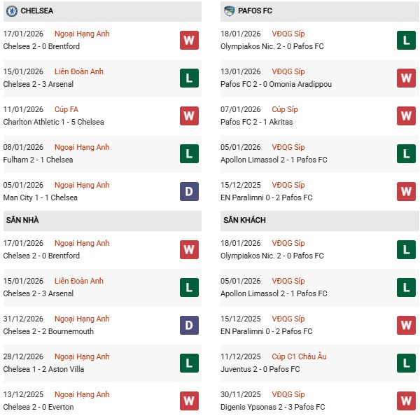 Thống kê đối đầu Chelsea vs Pafos: