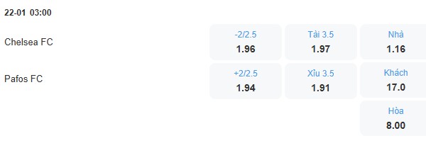 Hàng công Chelsea ghi không quá nhiều bàn ở mùa này và ở các trận gần đây, trong khi đó Pafos quá yếu để có thể gây ra khó khăn cho hàng thủ đội bóng nước Anh. Đây là điều sẽ khiến trận đấu giữa 2 đội không có nhiều bàn thắng, nên với kèo tổng số bàn thắng là 3 1/2 thì nên chọn kèo Xỉu thì cơ hội thắng cuộc cao hơn.