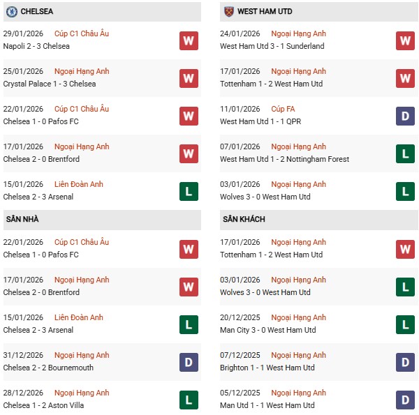 Lịch sử đối đầu trong 5 trận gần nhất nghiêng hoàn toàn về phía Chelsea với 4 chiến thắng. Trận lượt đi mùa này, Chelsea thậm chí đã đè bẹp đối thủ 5-1. Tuy nhiên, với đà tâm lý đang lên rất cao sau 3 trận thắng liên tiếp của West Ham, mức kèo chấp 1 trái có thể là thử thách không nhỏ cho đội chủ nhà. Dẫu vậy, đẳng cấp của các ngôi sao bên phía Chelsea vẫn được kỳ vọng sẽ giúp họ giành trọn 3 điểm dù có thể sẽ nhọc nhằn hơn.