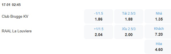 Kèo tổng số bàn thắng trận này là 2.75, con số không cao. Trong khi đó Club Brugge ghi tới 12 bàn ở 3 vòng gần nhất còn La Louviere chưa bao giờ là đội có hàng phòng ngự tốt. Đội khách vì thế sẽ thủng lưới nhiều trận này nên chọn kèo Tài thì cơ hội thắng cuộc cao hơn.