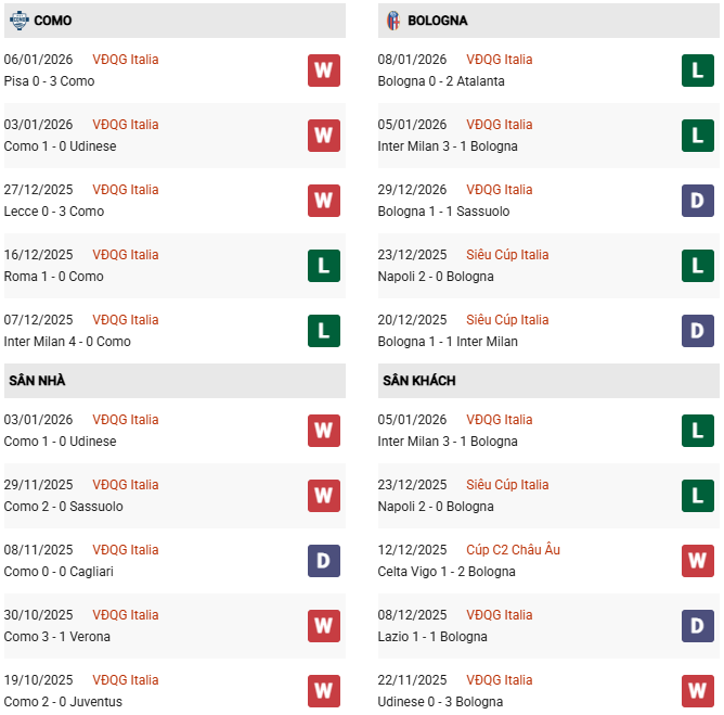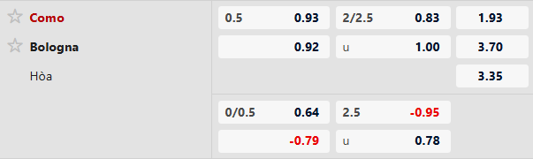 Como thực tế chỉ là đại diện mới lên hạng Serie A vào mùa trước và thành tích đối đầu của họ với Bologna là kém ấn tượng hơn. Trong 3 lần gặp gỡ trước đây, Bologna thể hiện đẳng cấp với 2 chiến thắng và 1 trận hòa. Tuy nhiên với điểm rơi phong độ ở thời điểm này, chuyên gia đang đặt niềm tin vào Como FC và thậm chí đội chủ nhà có thể nối dài chuỗi thắng mà không để thủng lưới lên con số 4.