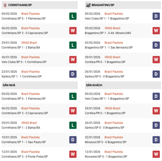 Lịch sử đối đầu: Đây là "khắc tinh" của Corinthians trong những năm gần đây. Bragantino đã thắng 7/10 lần chạm trán gần nhất giữa hai đội. Đặc biệt, trong 5 lần đối đầu gần nhất, Bragantino thắng tới 4 trận. Ngay cả khi làm khách tại Neo Química Arena, Bragantino vẫn thường xuyên ra về với 3 điểm.