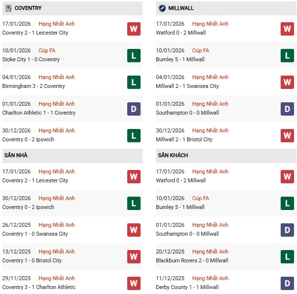- 10 trận đối đầu gần nhất giữa 2 đội, Coventry City thắng 5, thua 3 trước Millwall.