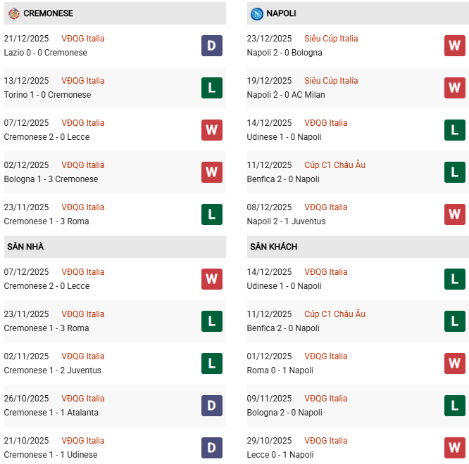 - 4 trận đối đầu gần nhất giữa 2 đội, Cremonese hòa 2, thua 2 trước Napoli.