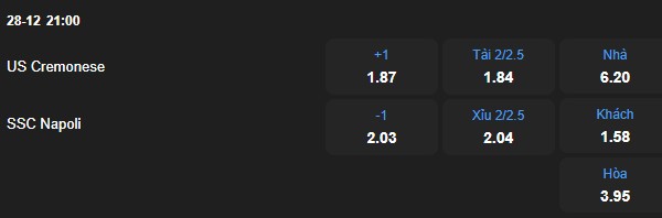 Dù Napoli có hàng công mạnh, nhưng các trận đấu của họ gần đây thường có xu hướng thực dụng. Thống kê chỉ ra rằng 5 trên 6 trận gần nhất của Napoli kết thúc với tổng số bàn thắng từ 2 trở xuống. Phía Cremonese, hàng thủ của họ đã cải thiện đáng kể khi chỉ để thủng lưới trung bình 0.8 bàn/trận trong 5 vòng đấu sân nhà vừa qua. Tin tưởng trận đấu sẽ về Xỉu.