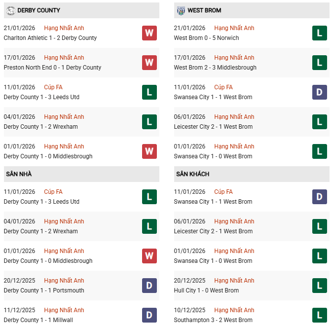 3/5 trận gần nhất của Derby County và 4/5 trận gần nhất của West Brom đều kết thúc với ít nhất 2 bàn thắng được ghi. Với thế trận đôi công nhiều khả năng xảy ra kịch bản nhiều bàn thắng.