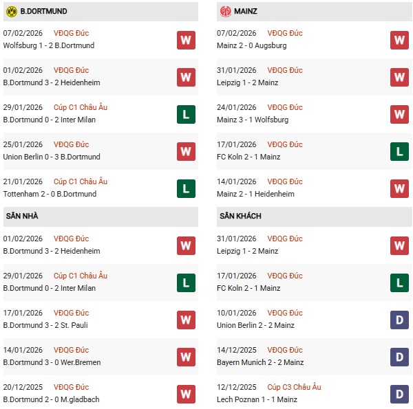 - 10 trận đối đầu gần nhất giữa 2 đội, Dortmund thắng 6, thua 2 trước Mainz.