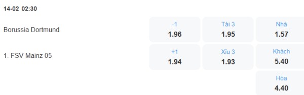 Dortmund thắng Mainz cả 2 lần gặp nhau gần nhất. Con số thống kê áp đảo này cộng với chất lượng đội hình mạnh hơn và lợi thế sân nhà thì sẽ không có gì ngạc nhiên nếu phần thắng trận này thuộc về họ. Với tỉ lệ kèo Dortmund chấp 1 trái thì nên đặt cửa cho đội chủ nhà thì cơ hội thắng cuộc cao hơn.