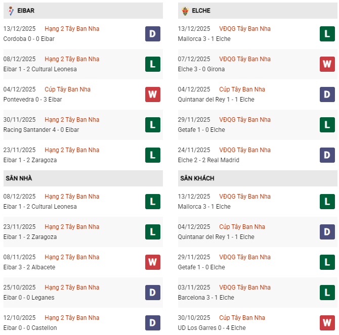 - 10 trận đối đầu vừa qua, Elche thắng 6 thua 3 và hòa 1 trước Eibar.