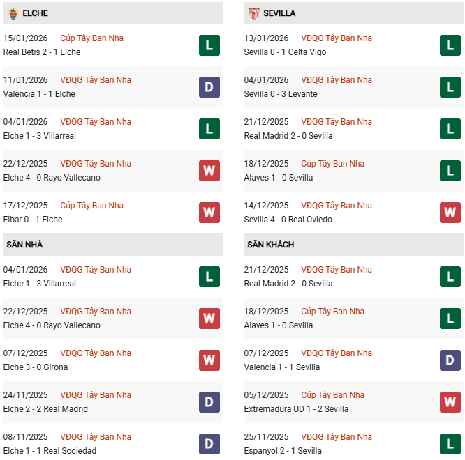 Thống kê phong độ Elche vs Sevilla:
