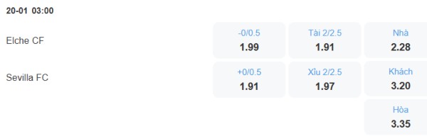 Sevilla hiện tại không có đội hình mạnh và phong độ thì rất tệ (3 trận thua liền), đương nhiên tệ hơn Elche. Cộng với việc Elche được đá sân nhà thì nhiều khả năng phần thắng trận này sẽ thuộc về họ. Với tỉ lệ kèo Elche chấp 1/4 trái thì nên đặt cửa cho đội bóng này.