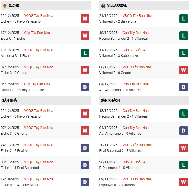 Nhìn vào quá khứ, hai đội tỏ ra khá cân bằng. Trong 6 lần chạm trán gần nhất, mỗi bên có 2 chiến thắng và 2 trận hòa. Đáng chú ý, lần gặp nhau gần đây nhất, Elche đã giành chiến thắng 3-1 đầy thuyết phục trước Villarreal, cho thấy họ không hề e ngại đối thủ này, đặc biệt là trên sân nhà.