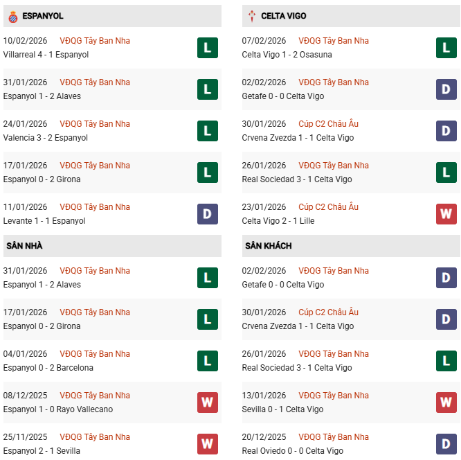 Thống kê phong độ Espanyol vs Celta Vigo: