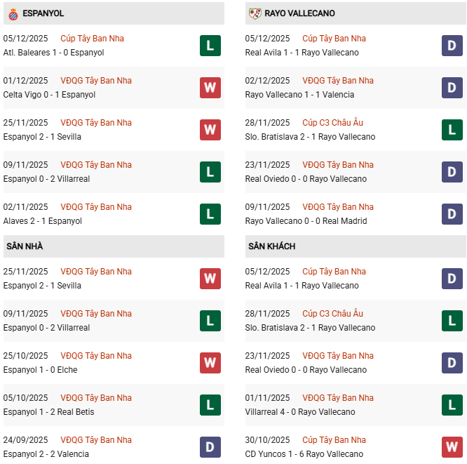 Thống kê phong độ Espanyol vs Rayo Vallecano: