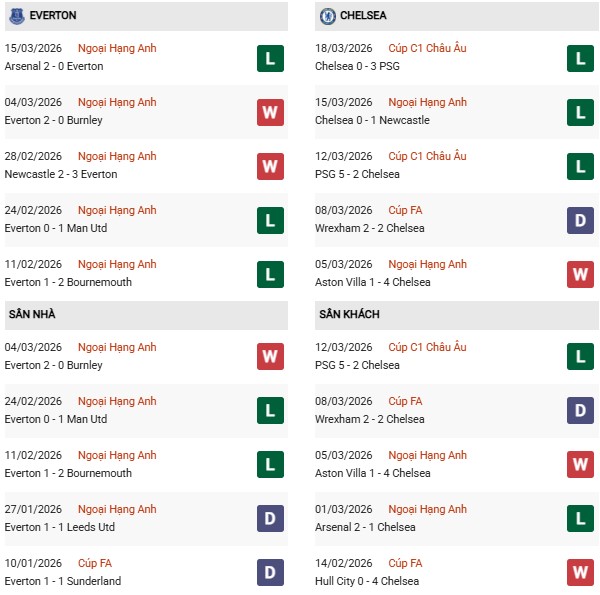 Thống kê phong độ Everton vs Chelsea: