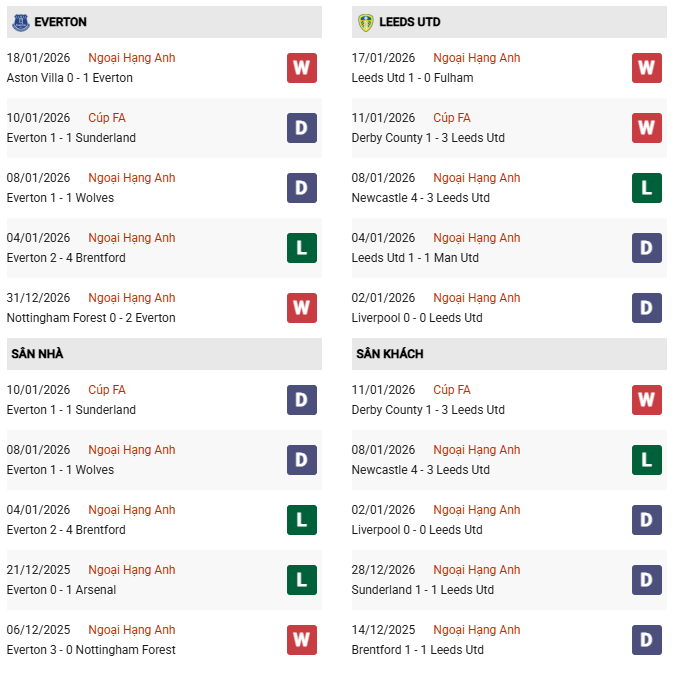 Thống kê phong độ Everton vs Leeds: