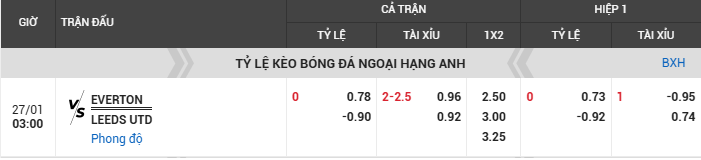 Nhận định kèo Everton vs Leeds, 03h00 ngày 27/01, vòng 23 Ngoại Hạng Anh. Đây được dự báo là màn so tài không hề dễ dàng cho cả hai đội, khi phong độ đôi bên đều mang nhiều nét trái chiều.