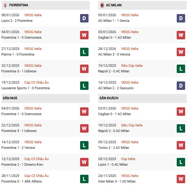 Thống kê đối đầu Fiorentina vs AC Milan:
