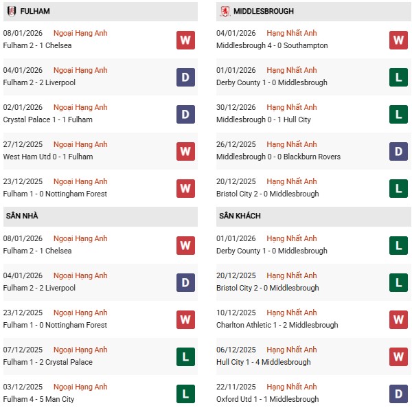 - 10 trận đối đầu gần nhất giữa 2 đội, Fulham thắng 4, thua 1 trước Middlesbrough.