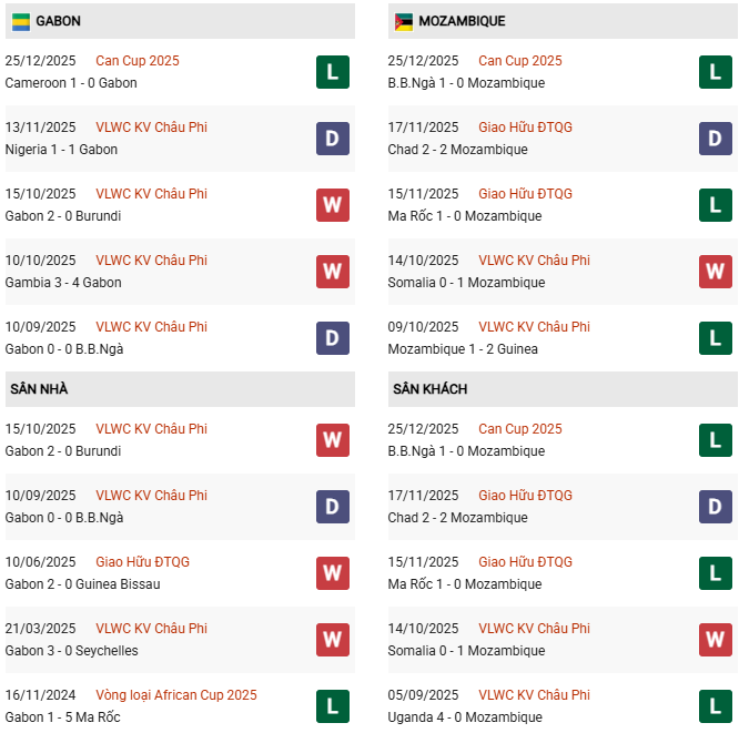 Thống kê phong độ Gabon vs Mozambique: