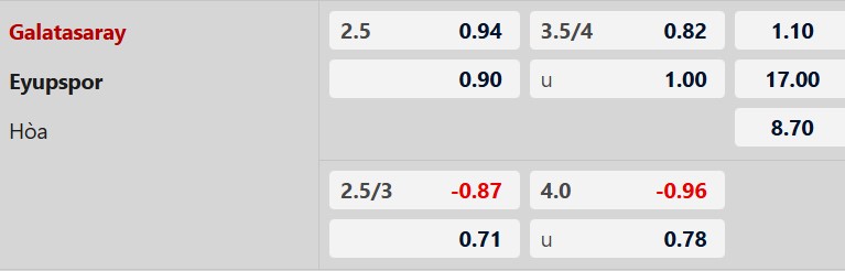 Galatasaray là ứng cử viên nặng ký cho chiến thắng với tỷ lệ chấp cực sâu (từ -2.25 đến -2.5).