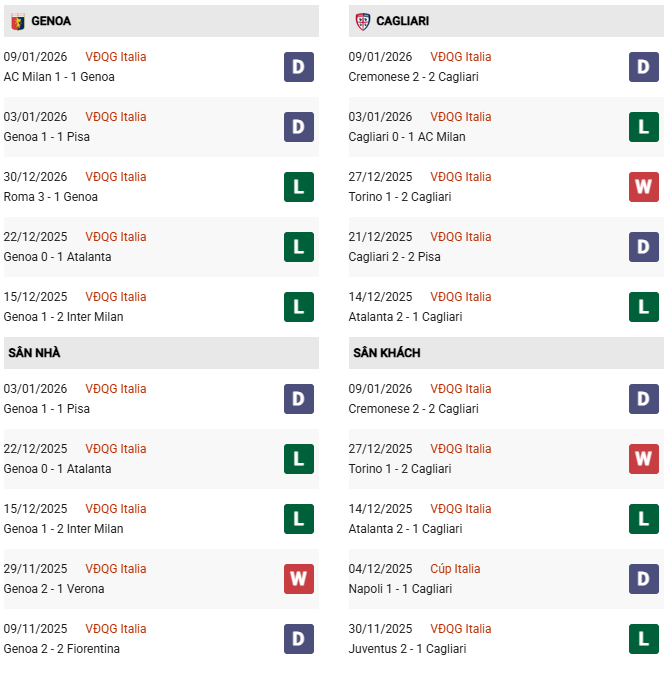 Thống kê phong độ Genoa vs Cagliari: