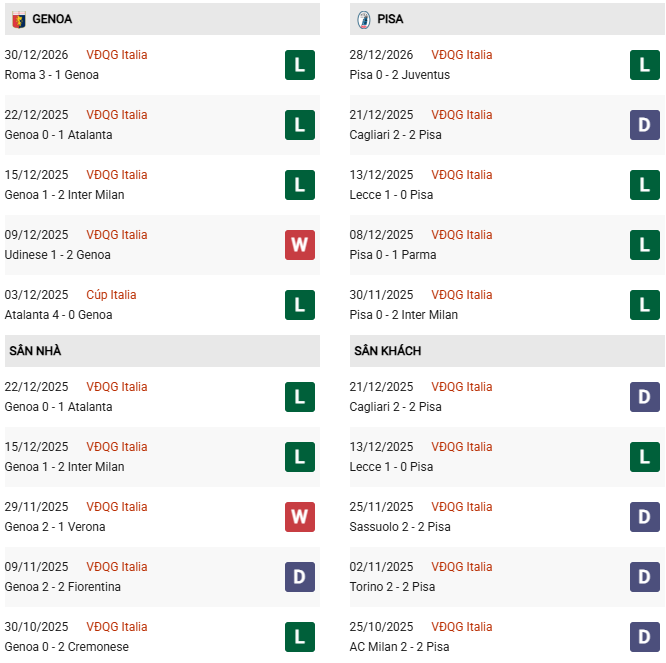 - 2 trận đối đầu gần nhất giữa 2 đội, Genoa thắng 1, hòa 1 trước Pisa.