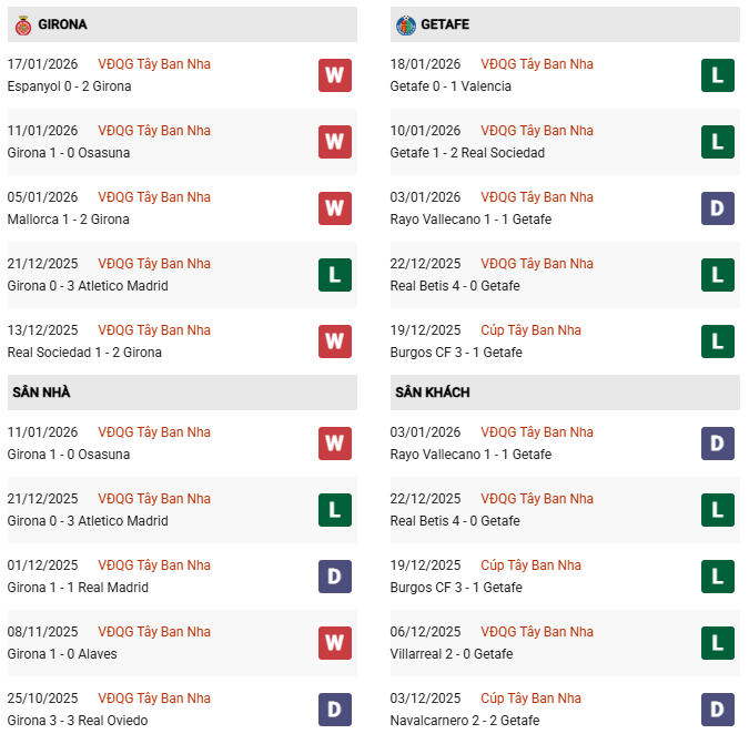 - 10 lần gần nhất gặp nhau, Getafe thắng 5 thua 3 và hòa 2 trước Girona