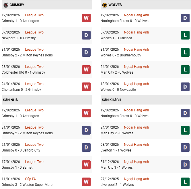 - 2 trận đối đầu gần nhất giữa 2 đội, Grimsby Town toàn thua trước Wolves.