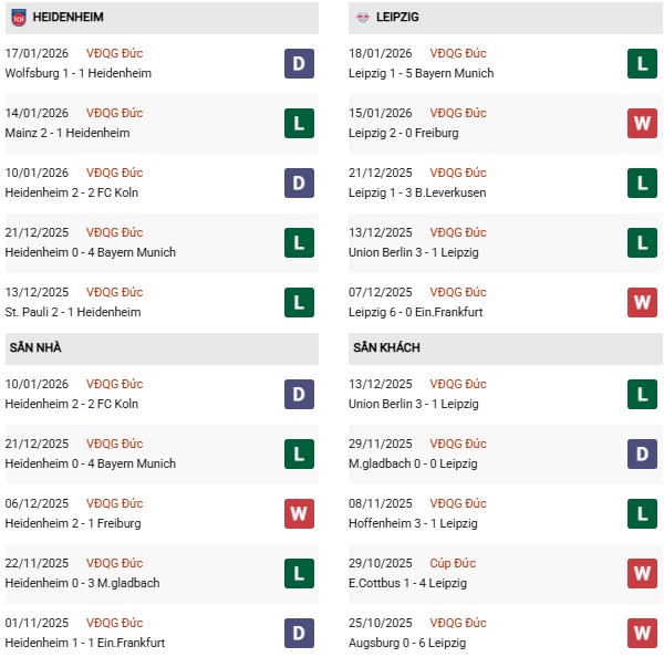 Xét về đối đầu, RB Leipzig rõ ràng chiếm ưu thế tuyệt đối. Heidenheim chưa từng thắng Leipzig trong 7 lần chạm trán gần nhất tại Bundesliga, thậm chí Leipzig thắng tới 83% số trận đối đầu kể từ năm 2016. Đáng chú ý, Leipzig cũng bất bại trong 3 lần gần nhất làm khách trên sân Voith-Arena, bao gồm chiến thắng 2-0 ở lượt đi mùa này.