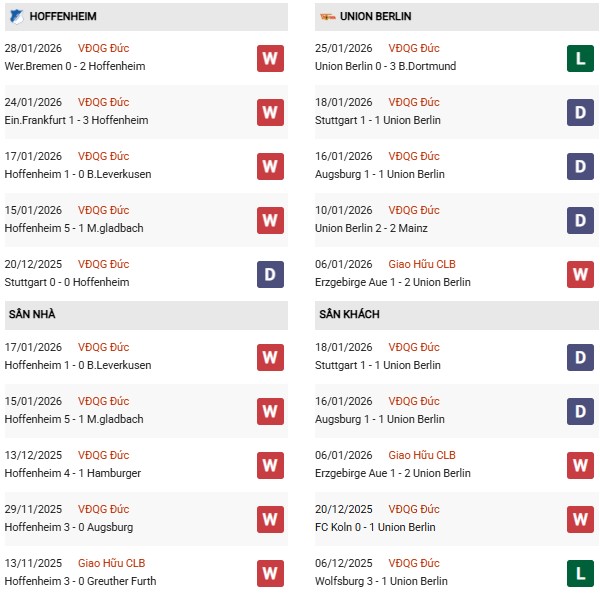 Hiệu suất ghi bàn: Hoffenheim đã ghi tới 13 bàn trong 6 trận gần nhất (trung bình hơn 2 bàn/trận). Union Berlin dù đang khủng hoảng nhưng vẫn có chuỗi 5 trận sân khách liên tiếp nổ súng trước đó.