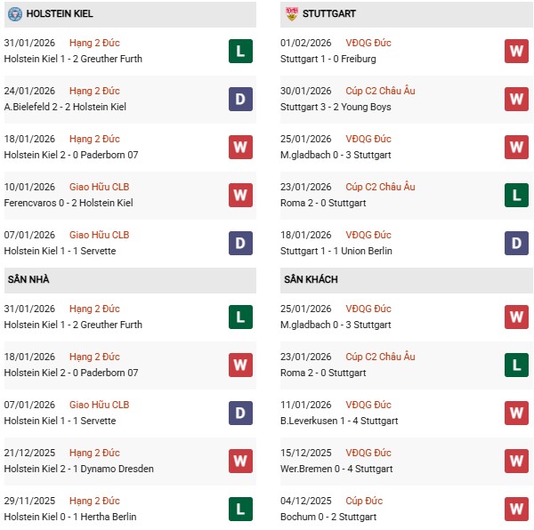 - Holstein Kiel thắng 2, hòa 1, thua 2 trong 5 trận gặp Stuttgart gần đây.